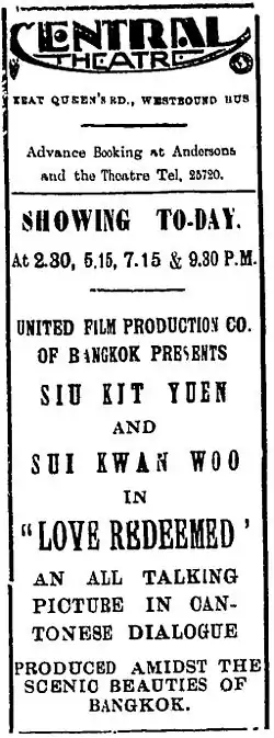 Advertisement of Siam Cantonese film Love Redeemed (湄江情浪) from Hong Kong Newspaper Hong Kong Daily Press on 18 December 1933 (Monday).