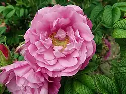 'Charles Albanel' is a medium-sized, very bushy Hybrid Rugosa variety, 2 to 4 ft (0.61–1.22 m) in height, with a 3 to 4 ft (0.91–1.22 m) spread.[2] It has semi-double (15–20 petals), medium-sized 3.1 in (79 mm) flowers and a cluster-flowered bloom form. Blooms are reddish-purple with shades of mauve, and have yellow stamens. Flowers are carried in clusters of 3–7 and have a strong, fruity fragrance. The plant has healthy pale green foliage and many prickles. 'Charles Albanel' grows more horizontally than vertically and is often grown as a low shrub. It flowers early and profusely and will repeat somewhat sporadically for the rest of the season.[1]