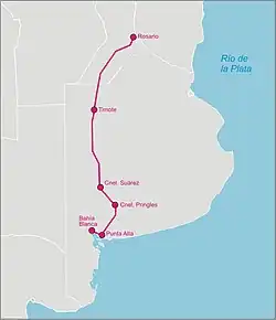 Puerto Belgrano, near the city of Bahía Blanca in Buenos Aires Province, is the main naval base in Argentina. The original idea behind the building of the railway was to link points that were closer to either Rosario or Bahía Blanca than they were to Buenos Aires, thereby taking traffic from the British-owned companies BA Great Southern and BA Western railways.