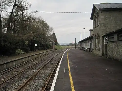 Roscrea station is on the Limerick-Ballybrophy railway line of the Irish railway network connecting to the main Cork-Dublin line at Ballybrophy. It is listed as a protected structure by Tipperary County Council (RPS Ref RC093).[1] The station is staffed and has a car park.[2] The station is 0.5 miles from Roscrea town centre.