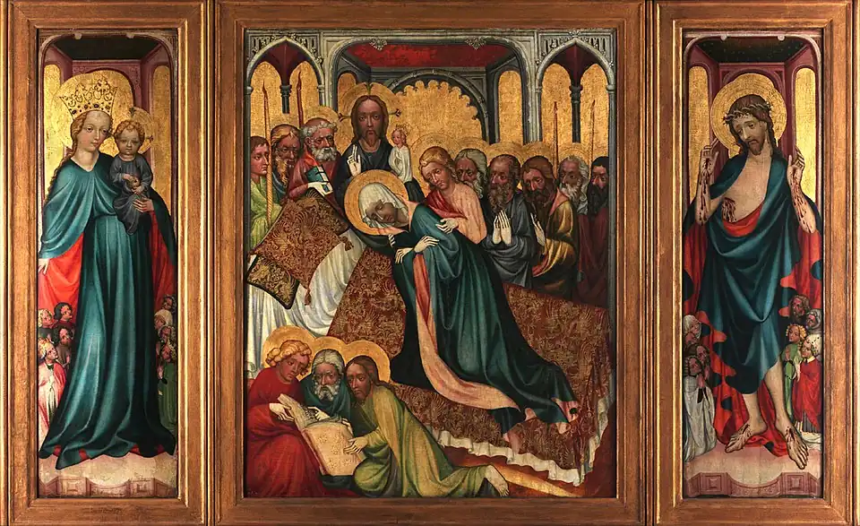 The central scene with the Death of the Virgin Mary is an example of the so-called Good Death, and the composition later spread from Bohemia to neighbouring countries. It depicts Mary kneeling on her bed during her last prayer, accompanied by the Apostles, led by St. Peter. In front is a group of three kneeling apostles with a book. The richly decorated bedspread with a brocade pattern on a gilded ground links the work to the Nuremberg painting.[9] The background is gilded, with Gothic architecture in the upper part.
