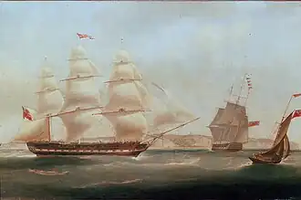 ![]() The East Indiaman Roxburgh Castle (left), with the ship Sir Edward Paget off Dover, by William John Huggins (1781–1845); National Maritime Museum, Greenwich