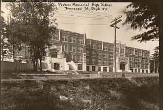 In 1926, the school moved from its second home on Warren and Montrose Streets (thereafter housing the Boston Clerical School) to a new building on Townsend Street and became known as the Memorial High School.[5] Prior to being erected, the Townsend Street building had been named as such in 1925 by members of the Boston School Committee "in commemoration of the Boston schoolmen who lost their lives during the World War".[6] The school building was built in two phases, a girls' portion completed with classes started for the 1926-27 school year, and a boys' half completed with classes started in September, 1928.[7][8] The two halves were treated as separate institutions, Memorial High School for Boys and Memorial High School for Girls, both with its own headmasters and set of teachers. The school was the first in the City of Boston to feature a swimming pool.[7] Prior to the 1929 school year, the name of the school was changed to the Roxbury Memorial High School.[9] The Warren Branch of the Boston Public Library (BPL) moved to the building in 1926 and was renamed the Memorial Branch. In December 1970, the branch relocated to the corner of Warren and Crawford Streets and dubbed the Grove Hall Branch of the BPL.[10][11]