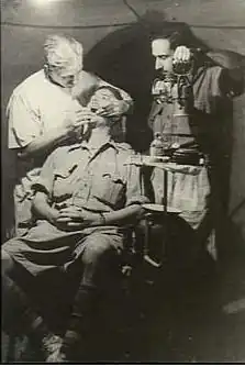Later, as the Australian Imperial Force (AIF) was raised, a dental officer was recruited and situated in each military district with the remit of providing advice to senior medical personnel. They were not to carry out dental procedures, however, and as a result civilian dentists offered free services to soldiers while undertaking training in Australia.[4] Upon the AIF's arrival in Egypt in 1915, General William Throsby Bridges argued the case for dentists to be attached to the army in the field, stating that it would reduce the instances of soldiers having to be evacuated from the field as 'dental casualties'.[4] While some progress towards mitigating this was taken in January 1915 when the Australian Army Medical Corps (Dental) Reserve was approved, appointments were slow and consequently the AIF troops that deployed to Gallipoli did so without dental support. Dental health became a serious problem for the Australian army on the Gallipoli Peninsula, contributing as early as June 1915 to a significant number of medical evacuations from the front lines.[5] By July 1915, over 600 soldiers from the 1st Division alone had been evacuated as dental casualties.[6]