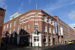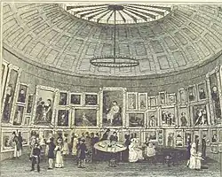 The RBSA was established as the Birmingham Society of Artists in 1821, though it can trace its origins back further to the life drawing academy opened by Samuel Lines, Moses Haughton, Vincent Barber and Charles Barber in Peck Lane (now the site of New Street Station) in 1809.[3] From this group was founded the Birmingham Academy of Arts in 1814, whose first exhibition was held that year.[4] In 1821, the Birmingham Society of Arts moved into a circular building on New Street however this was replaced by a new gallery and set of offices built behind a fine neo-classical portico in New Street by architects Thomas Rickman and Henry Hutchinson in 1829. In 1868 the RBSA received its royal charter and adopted its current name.