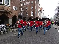 Today, the band performs throughout Denmark and abroad. The DKLM's area of responsibility accounts for the national capital, Copenhagen. When on parade, they wear the full dress uniform of the Life Guards (a scarlet tunic, blue trousers, and a bearskin cap). It is mainly seen accompanying the Guard Company when it executes the changing of the guard in front of Amalienborg, where the band plays traditional military marches. It takes part in the annual Tattoo of Den Kongelige Livgarde at Rosenborg Castle. The repertoire of the DKLM of today is very diverse and spans a lot of genres. The band almost exclusively plays Kong Christian stod ved højen mast, the Royal anthem, in the presence of the monarch or other Danish members of the House of Glücksburg. In addition, to its ceremonial role, musicians of the DKLM are trained infantryman who serve with the regiment.[2]