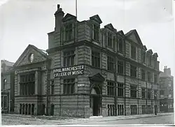 The RMCM opened in 1893 in a former club building on the corner of Ducie Grove and Ducie Street,[2] near Oxford Road. The building was adapted for use as a college by the architects Salomons and Steinthal, and contained a 400-seat concert hall lined with walnut wood panelling, classrooms, a library and offices. According to the Manchester Guardian, instead of a formal opening ceremony, donors were invited to a conversazione with Sir Charles Hallé and other musicians on Saturday October 7, 1893.[3] Students were admitted in October 1893.[4][5]