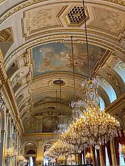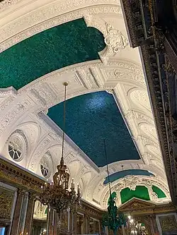At that time, the barrel ceiling remained unfinished and only covered with a layer of stucco. It was not until 2004 that, at the request of Queen Paola,[20] the artist Jan Fabre installed there a work called Heaven of Delight made up of more than a million beetle elytra in order to reflect the light with a metallic green tint.[21] Despite the artist's conviction for sexual offences, the palace decided to keep his creation.[22] The room is mainly used today for the reception of letters of credence from ambassadors posted in Brussels.