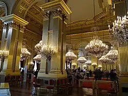 The Large Anteroom was used under William I of the Netherlands as the Throne Room. Its decoration is therefore loaded with many political symbols relating to the United Kingdom of the Netherlands. Produced by the sculptors François Rude and Jean-Louis van Geel around 1826, the frieze running all around the room thus represents the four main economic activities of the country (Trade, Navigation, Industry and Agriculture) and the four virtues of good governance (Abundance, Prudence, Armed force and Peace).[17] The frieze was reworked under Leopold II to include his cipher and the coat of arms of Belgium.
