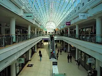 It in located in the centre of the town on the main street, The Parade. Opened in 1988 by Queen Elizabeth II[1] at a cost of £35 million, there is a seven-storey car park adjacent to it and the town's bus stops are nearby.