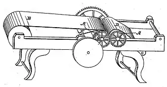 - ^ 76 U.S. at 789–90, 794; Goodyear v. Providence Rubber Co., 10 F. Cas. 712, 720 (C.C.D.R.I. 1864). Goodyear received other patents, as well, including one, U.S. Patent No. 9319, on a machine for making vulcanized-rubber fabric, depicted at right.