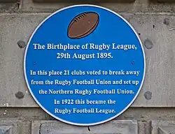 Twenty-one northern clubs held a meeting and by a majority of 20 to 1 voted to secede from the Rugby Football Union to set up their own Northern Rugby Football Union at the George Hotel, Huddersfield on 29 August 1895. In 1922 this became the Rugby Football League.