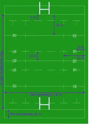 As other football codes, such as association football and rugby league, have specified a preferred or standard 68 metre width, this is often used unless a ground has been specifically designed to accommodate a 70-metre rugby field. 100 metres is the typical length, with a line (see below) often marked at halfway with "50" on it, representing 50 metres from each goal line. The variations have been allowed in the Laws, possibly to accommodate older grounds (perhaps even pre-metrification when yards and feet were specified) and developing nations.