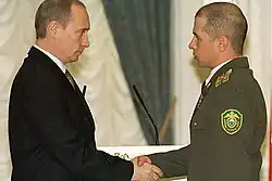 Ruslan Kokshin (born May 7, 1979) is an officer in the Russian military. While serving as a leader of a mortar platoon, Kokshin located and took out a small group of opposition forces in Chechnya. Due to this action by him, Kokshin was awarded the title Hero of the Russian Federation for his "heroic duty while in the service of the state."[1]