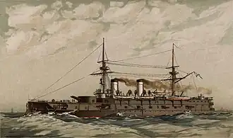 On 6 June 1905, she was taken into the Imperial Japanese Navy and renamed Iki, after Iki Island in the Sea of Japan, near the site of the Battle of Tsushima. She served as a gunnery training ship until 12 December 1910 when she was redesignated as a first-class coast defense ship and a training vessel.[12] As Iki she was armed with her original 12-inch/30 caliber guns in a forward twin turret, six 6-inch/40 caliber Armstrong Pattern Z guns in single mounts, six 4.7-inch/40 caliber Armstrong Pattern T guns in single mounts, six 3-inch/40 caliber Armstrong N guns in single mounts and six 18-inch torpedoes.[13] She was stricken 1 May 1915 and sunk as a target on 3 October 1915 by the battlecruisers Kongō and Hiei,[12] although Watts and Gordon say that she was scrapped in 1922.[14]