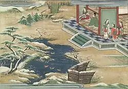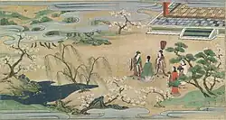 However, the view to the four seasons is incorporated in Mrs. Ozaki's translation: cherry blossom in bloom to the east (spring), buzzing cicadas to the south (summer), multi-colored maple leaves to the west (autumn), and snow-covered ground to the north (winter).[34] This is presumably based on a text edited by Iwaya Sazanami,[35] probably the text of Nihon mukashibanashi (1896),[36] which corresponds roughly with a version from the Otogizōshi.[32] The four seasons also figure in F. Hadland Davis's synopsis (1912).[37] The usual bird which sings in spring is the bush warbler, not actually a nightingale. More precise translations from the otogizōshi text are given elsewhere.[38]