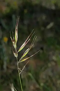 Compound inflorescence (panicle) which is ovate in shape, compact or loose, 2 cm (0.79 in) to 7 cm (2.8 in) long.[2] Inflorescence has 4 to 15 spikelets, which are each flower together with lemma and palea that enclose it.[1] Spikelets green-tinged with purple and are 4–8-flowered, 11 mm (0.43 in) to 18 mm (0.71 in) long.[3] Glumes (bracts at the base of the grass spikelet) subequal, tapering gradually to a point, 11 mm (0.43 in) to 19 mm (0.75 in) long. Lemma rather broad, 3 mm (0.12 in) to 4 mm (0.16 in) long, with 2 rows of hairs, the lower about 1 mm (0.039 in) above the hardened extension from the base of a floret (callus) tuft, and virtually reaching the dense upper ring, the hairs of which normally exceed the twisted part of the central awn. Lateral lobes erect or slightly spreading, 7 mm (0.28 in) to 11 mm (0.43 in) long, abruptly tapering into fine hairs which are about as long as or longer than the flat part. Central awn exceeding lateral lobes by 3 mm (0.12 in) to 8 mm (0.31 in). Palea obovate in shape, the margin with conspicuous hairs, exceeding sinus by about 1 mm (0.039 in). Flowers occur from September to December.