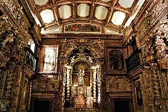 The Church presents a style faithful to the Rococo baroque and is considered one of the most important historical-artistic religious monuments in its category. They emphasize the tower covered with tiles and the superposition of vaults, the carved sandstone, and stylized flowers are interspersed with Baroque reliefs. The walls are covered with Portuguese tiles that form panels on the history of Joseph in Egypt. The pulpit is a work of art with a rich work of gold carving, considered by UNESCO as unique throughout the world. It is speculated that he was influenced by indigenous art.[4]