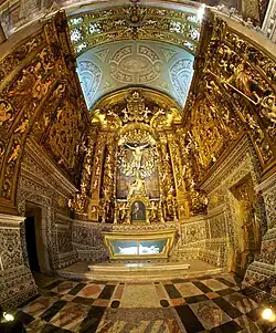The present decoration dates from the late 17th and early 18th centuries. The altar piece was carved by the Lisbon master carver Matias Rodrigues de Carvalho.[33] The Portuguese Baroque lacework and the crown of angel heads flanking the central sculpture of Our Lady of the Assumption date from the 18th century.[34] In the altar piece are also a number of reliquary busts, many with connections to the Society of Jesus. The breccia marble on the lower third of the walls was executed by the Lisbon master masons José Freire and Luís dos Santos and finished in 1719.[35]