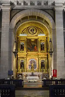 The composition of the altar piece, with long proportions and decorative austerity, includes sets of paired Corinthian columns mounted in two levels.[14] The lower third of each column is decorated with acanthus garlands, volutes and hanging objects. The semi-circular pinnacle incorporates a painting in the roundel, tempera on wood, representing Christ, Saviour of the World.[15] The altar piece is one of the most important in the Jesuit tradition: the founder of the Society and its greatest saints — Ignatius of Loyola, Francis Xavier, Aloysius Gonzaga, and Francis Borgia — are represented in the four niches by statues, commissioned in 1630, which recently have been attributed to the Portuguese sculptor Manuel Pereira (1604–1667).[16] The central niche of the lower portion of the altar piece houses a 17th-century statue of the Madonna and Child in upholstered wood. In front stand silvered wood statues of the four Evangelists.[17] On the upper level is a niche for the exhibition of the Holy Sacrament — the “throne” (a characteristic Portuguese invention) usually covered by a large oil painting of a New Testament scene which changes according to the religious season.[18] The practice of changing the scenography of the High Altar was a Jesuit innovation. The throne at São Roque (usually not visible to the public) was one of the first permanent ones to be created in Portugal. It has six Corinthian columns and four arches, round geometric elements and two large carved and gilded side panels with symbolic trees in relief. The whole forms a sort of pyramid in several levels.