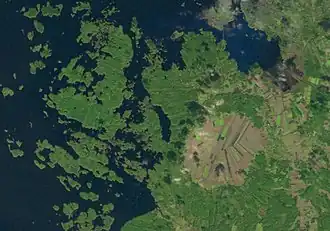 Söderfjärden is a polder in Ostrobothnia, western Finland, 10 kilometres south of the town of Vaasa. The plain is in an impact crater dating back to more than 640 million years ago (Proterozoic, near the end of the Cryogenian). The crater's diameter is 6.6 kilometres (4.1 mi) and its maximum depth is 300 metres (980 ft). It is filled with Cambrian sandstones leaving only the outer rim visible. There is also a central uplift, which is buried. After rising from the sea due to post-glacial rebound, Söderfjärden was a wetland but was later drained with help of a pump station. It is currently cultivated and is clearly visible from air as a large hexagonal field. This makes Söderfjärden unique among the other impact structures in Finland which are at least partially below sea level. The area of the basin is divided half and half between Vaasa and Korsholm, with a small corner belonging to Malax.[1][2]