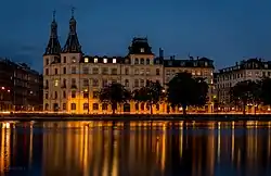 Just south of Søtorvet, at the end of a small cul-de-sac, is Hotel Kong Arthur. The building was originally a home for apprentices. It was designed by Georg Ebbe Wineken Møller and inaugurated on 4 October 1882.[3] The former Catholic Apostolic church on the corner of Nørre Søgade and Gyldenløvesgade was inaugurated on 1 August 1870.