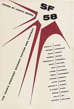 SF '58: The Year's Greatest Science Fiction and Fantasy is a 1958 anthology of science fiction and fantasy short stories and articles edited by Judith Merril. It was published by Gnome Press in an edition of 4,000 copies of which 1,263 were never bound. It was the third in a series of 12 annual anthologies edited by Merrill. Most of the stories and articles originally appeared in the magazines Science-Fantasy, Playboy, Infinity Science Fiction, Atlantic Monthly, Fantasy and Science Fiction, If, Venture, Mademoiselle, Boys' Life and The New York Times.