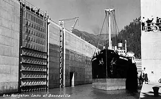 In 1938, the world's largest single-lift lock was opened at the Bonneville Dam on the Columbia River.[4] As part of the opening ceremonies of the lock, Captain Arthur Riggs, a veteran upper Columbia river pilot, took Charles L. Wheeler Jr. – which was operated by McCormick Steamship Company and loaded with sugar, building materials, beer, hardware, automobiles, and general freight – upstream from Portland, transited the Bonneville Locks and continued on to the historic upper river steamboat port of [[The Dalles, Oregon.[5] She was the first ship to transit the lock at Bonneville Dam[6] and the first ocean-going merchant ship to transit the Columbia River all the way to The Dalles, located 200 miles (320 km) upstream from the Pacific Ocean.[7] Once unloaded at the Port of the Dalles, the ship was then loaded with lumber, wheat, flour, and other local products for the return voyage. Residents of The Dalles had hoped the trip would bring increased business to their port, but the trip was a one-time event,[5] and the Columbia River is dominated by barge traffic.[4]