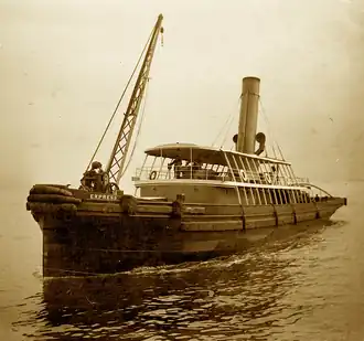The Express was a twin screw tugboat-passenger tender built for the Anchor Line in 1880. She was launched in October, and completed just over a month later. She had only one deck with limited passenger accommodation, and a large crane forward to handle cargoes. Her 46 m (150 ft) long hull was built out of iron, which was still very commonplace. However, she boasted twin screws,[1] which was a rather unique feature that was soon to become the norm as the evolution of shipping continued to pick up in pace.
