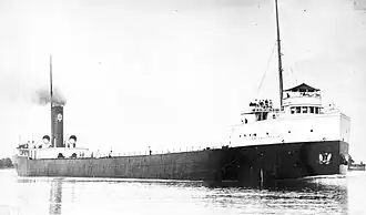 On 8 November 1913 the Hanna was laden with a cargo of coal bound from Lorain, Ohio, to Fort William, entered Lake Huron in the early hours of November 9. The crew of Hanna had no idea that in a few hours, they would encounter the worst storm in Great Lakes history.[2] While much larger ships sank, such as James Carruthers, the Hanna was caught in the trough of a large wave, rolled over, and was tossed ashore near Port Austin, Michigan.[3] The Hanna sustained a lot of damage including smashed windows and various topside damage. The ship's hull cracked at the 17th hatch, was flooded aft, and the smokestack came crashing down over the aft deckhouse. All 25 crew members on board survived and were later rescued. The bad weather that winter made it impossible to refloat the ship until the following year.[4]