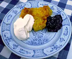 Saffranspannkaka or gotlandspannkaka (English: saffron pancake or Gotland pancake, Gutnish: saffranspannkake or saffranspannkakå) is a dessert from the island of Gotland, Sweden, and is considered one of their provincial dishes.[1] It is made of rice pudding, cream, milk, sugar, egg, chopped almonds, and saffron mixed together and baked. The cake can be eaten tepid or cold and is traditionally served with dewberry jam and whipped cream.[2][3]