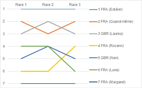 Rozenn was penalized by the jury for touching a buoy in race 1.[1] She was awarded a number of points equal to that he would have obtained arriving last, decreases by one point.