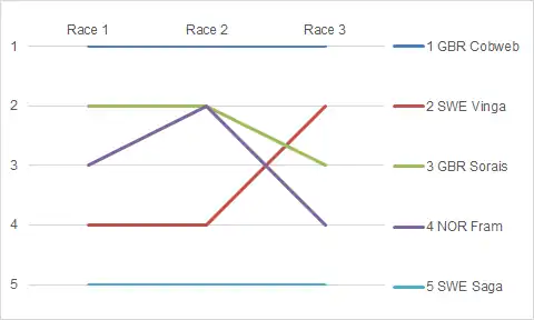 | Rank | Country | Helmsman | Crew | Boat | Race 1 | Race 2 | Race 3 | Total | |||