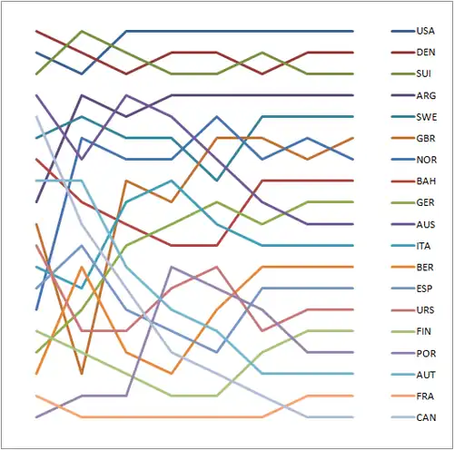Helmsman (Country) | Crew | Yachtname | Sail No. | Race I | Race II | Race III | Race IV | Race V | Race VI | Race VII | Total Points [2] |