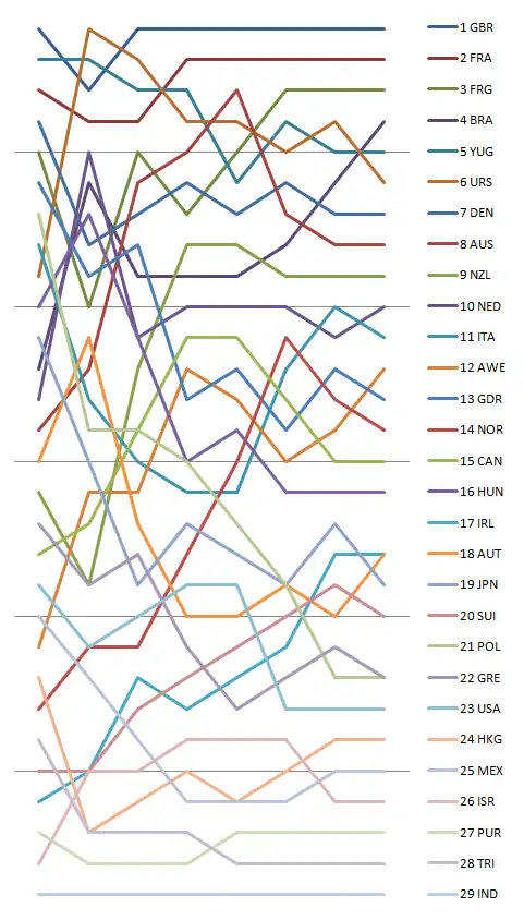 | Rank | Country | Helmsman | Crew | Race 1 | Race 2 | Race 3 | Race 4 | Race 5 | Race 6 | Race 7 | Total | Total – discard | |||||||