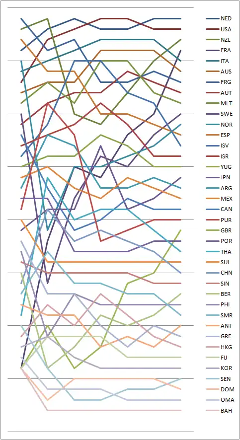 Graph showing the daily standings in the Windglider during the 1984 Summer Olympics