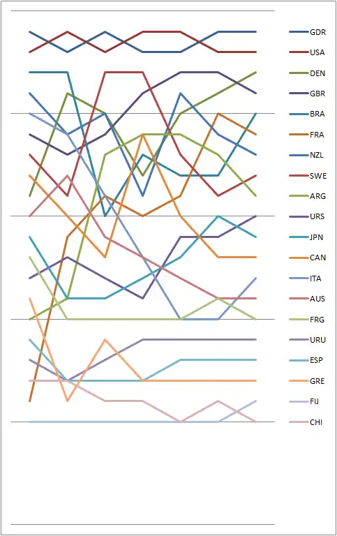 Graph showing the daily standings in the Soling during the 1988 Summer Olympics