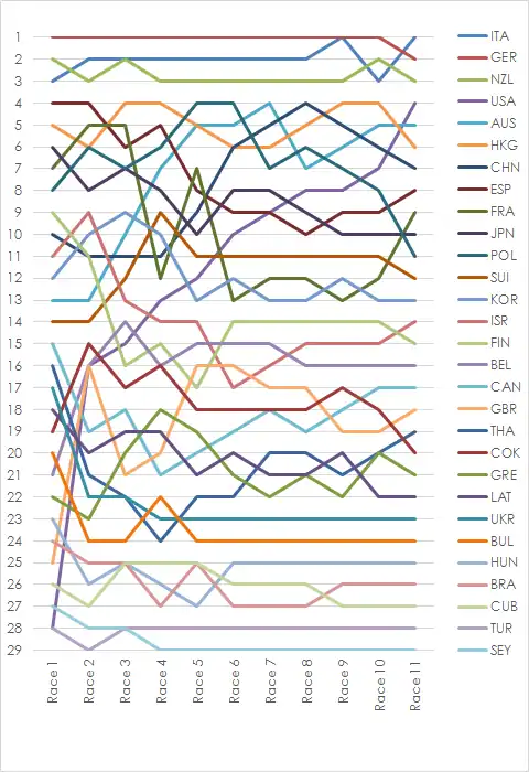 Graph showing the daily standings in the Women's Mistral One Design during the 2000 Summer Olympics