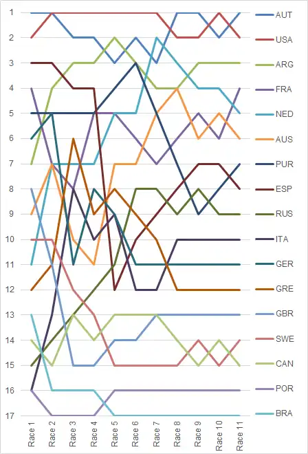 | Rank | Country | Helmsman | Crew | Race 1 | Race 2 | Race 3 | Race 4 | Race 5 | Race 6 | Race 7 | Race 8 | Race 9 | Race 10 | Race 11 | Total | Total – discard | |||||||||||