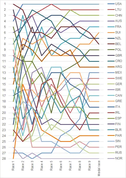 Graph showing the daily standings in the Laser Radial during the 2008 Summer Olympics