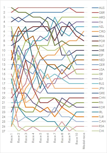 | ● | Practice race | ● | Race on Portland | ● | Race on Nothe | ● | Race on West | ● | Race on South | ● | Medal race on Nothe |