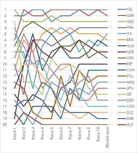 Graph showing the daily standings in the Women's 470 during the 2012 Summer Olympics