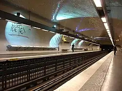 Since the métro's centenary in 2000 and until 2016, the station's platforms have had numerous temporary exhibitions on the history literature in the neighbourhood.[1] The platforms also had displays that presented the stories of young literary talents.