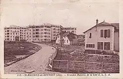 The 1920s saw the installation of new textile factories in the Lyon Region, particularly in Saint-Maurice-de-Beynost.[1] Maurice Cusin was looking for a site in the Lyon region to establish the second factory of the Société lyonnaise de soie artificielle (SLSA), after the one in Décines created in 1922.[2] In 1928, the municipal council of Saint-Maurice-de-Beynost spread a favorable opinion on the installation of this factory on municipal territory.[3][4] There was some local reluctance (for fear of nuisance from industrial activity), but despite this, Maurice Cusin bought 50 hectares in Les Brotteaux, between the Miribel canal and the Lyon-Geneva railway line.[5]