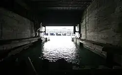Between late 1943 and early 1944, a fortified lock was built to protect submarines during their transfer from the Loire river and the pens. The lock is 155 metres (509 ft) long, 25 m (82 ft) wide, and 14 m (46 ft) high; the roof features anti-aircraft armament.