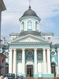 Private stables of Empress Elizabeth of Russia stood on its location in the mid-18th century,[2] until it was granted to Petersburg Armenians on May 2, 1770 by Empress Catherine the Great, upon the request of her Armenian jeweler Ivan Lazarev.[4] Its construction was primarily financed by Lazarev,[2][5] who provided 30,000 rubles of the total 33,000.[6] The church was designed by Yury Felten[4][2] and is an early example of Russian Classicism.[2] Its construction began in the spring of 1771[1] and was completed in 1776.[7] The church was consecrated on February 18, 1780, by Hovsep Arghutian (Prince Argutinsky-Dolgorukov), the archbishop of the Russian diocese of the Armenian church, in the presence of Prince Grigory Potemkin, the favourite of Catherine the Great.[4][3] It is named after Catherine of Alexandria, a namesake of the empress.[8] Colored white and blue, it has a neoclassical portico and single cupola.[9]