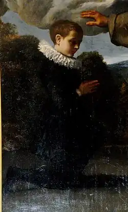 In any case, except for extreme positions that consider the panel to be purely a workshop work,[2] even the critical positions that see the contribution of assistants accept the attribution of some parts of the composition to Annibale. In particular, there is substantial agreement on the fact that at least the figure of the young Diego de Herrera – plausibly painted from life – is the fruit of Annibale's brush.