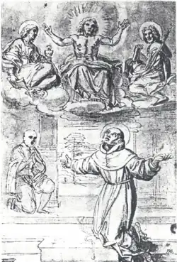 It was produced as the altarpiece for the Spanish banker Juan Enriquez de Herrera's (1539–1610) family chapel in San Giacomo degli Spagnoli, then Spain's national church in Rome and later rebuilt from scratch to become Nostra Signora del Sacro Cuore. Herrera also commissioned Carracci to decorate the whole chapel, producing designs for frescoes by his students Francesco Albani, Sisto Badalocchio, Giovanni Lanfranco and Domenichino. Work on the chapel started in 1602 as an ex voto for Herrera's son Diego, named after Didacus of Alcalá, both of whom appear in the altarpiece.