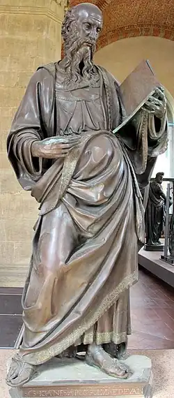 Saint John the Evangelist is a 2.66 m (8.7 feet) high bronze statue of John the Evangelist by Baccio da Montelupo, completed in 1515. It was commissioned by the Arte della Seta as part of a cycle of fourteen sculptures for the external niches of Orsanmichele, each showing the patron saint of one of the guilds of Florence. It is now in the Museo di Orsanmichele, although a replica fills its original niche.