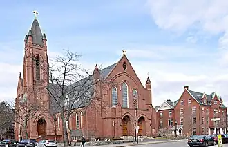 The church is a red brick Gothic Revival structure with brownstone trim, featuring a tower that is 146 feet (45 m) in height. It has a basically cruciform plan, with a rounded apse and the tower set at the southwest corner of the crossing point. The main entrance is at its southern end, and has two arched doorways and a niche above for a statue of the Virgin Mary. The interior walls are lined with Kilkenny marble and onyx, and the altar of Caen stone with marble trim.[2]